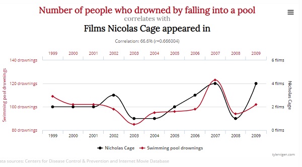 Nicholas Cage’in rol aldığı film sayısı ile havuzda boğulan insan sayısının bağıntılı bir görünüm sergilemesi, iki verinin birbiriyle ilişkiye sahip olduğu anlamına gelmez.