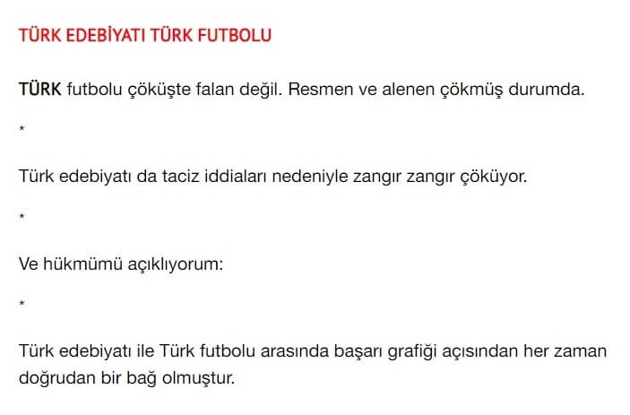 TÜRK EDEBİYATI TÜRK FUTBOLU TÜRK futbolu çöküşte falan değil. Resmen ve alenen çökmüş durumda. * Türk edebiyatı da taciz iddiaları nedeniyle zangır zangır çöküyor. * Ve hükmümü açıklıyorum: * Türk edebiyatı ile Türk futbolu arasında başarı grafiği açısından her zaman doğrudan bir bağ olmuştur.