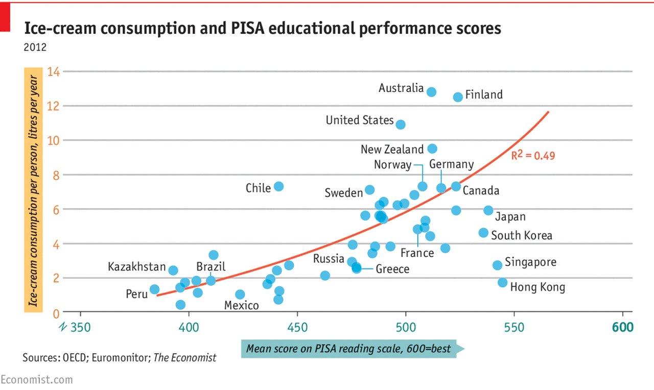 Ülkelerin dondurma tüketimi ile OECD PISA sınav sonuçları grafiğe döküldüğünde, aralarında bir ilişki bulunduğu görünümü oluşsa da, aslında bu veriler arasında “sahte korelasyon” bulunmaktadır. Daha fazla dondurma tüketiminin daha yüksek PISA skoru sağlaması (ya da tam tersi) beklenemez.