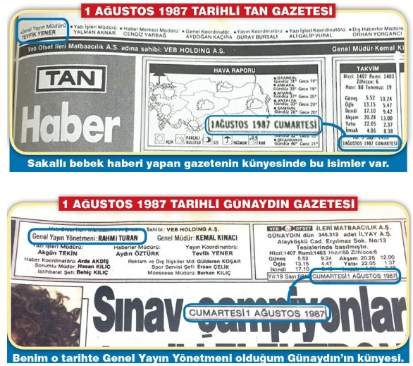 Sözcü’deki “Sakallı Bebek Olayı” başlıklı 27 Kasım 2019 tarihli yazısında Rahmi Turan 1 Ağustos 1987 tarihinde Tan Gazetesinin ve kendisinin başında olduğu Günaydın Gazetesinin künyesini paylaşmış.
