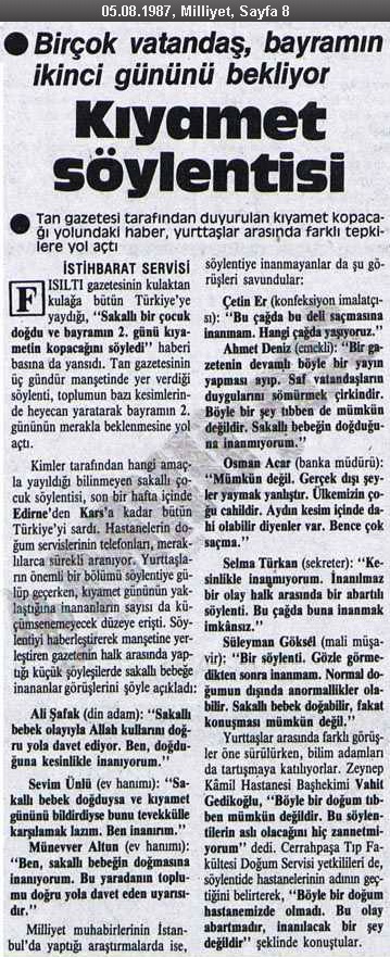 Kıyametin habercisi sakallı bebek söylentisi halkta panik havası uyandırmıştı. Sakallı bebeğin doğduğu söylenen Cerrahpaşa Hastanesi’nin bayramın 2. gününde kıyamet gibi olduğu belirtilmekteydi (Nokta Dergisi, 16 Ağustos 1987 tarihli sayısı).