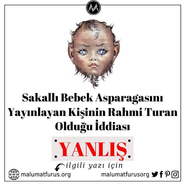Türkiye’nin en ünlü asparagas haberlerinden biri olan “sakallı bebek”i Rahmi Turan’ın Tan Gazetesindeyken yayınladığı iddiası doğru değil. Sakallı Bebek’in haberleştirildiği 1 Ağustos 1987 tarihinde Tan ve Günaydın gazetelerinin künyeleri incelendiğinde Rahmi Turan’ın Tan Gazetesiyle bir bağının bulunmadığı, Günaydın Gazetesinin Genel Yayın Yönetmeni olduğu görülmektedir.