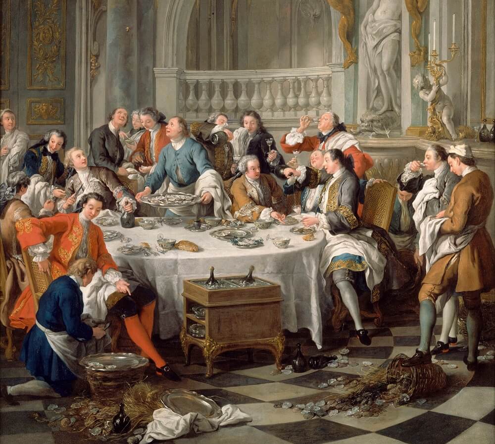 Fransa Kralı XV. Louis (1710-1774) tarafından görevlendirilen Jean-François de Troy’un 1734 tarihli “İstiridye Yemeği” (“Le Déjeuner d’huîtres” / “The Oyster Dinner“) adlı tablosunda şampanya kadehleri (coupe) görülebiliyor. Bu durum da bize şampanya kadehlerinin şeklinin Marie Antoniette’in göğüs kalıbına dayandığı iddiasının gerçeği yansıtmadığını işaret ediyor.