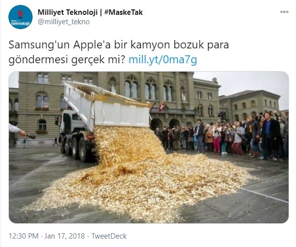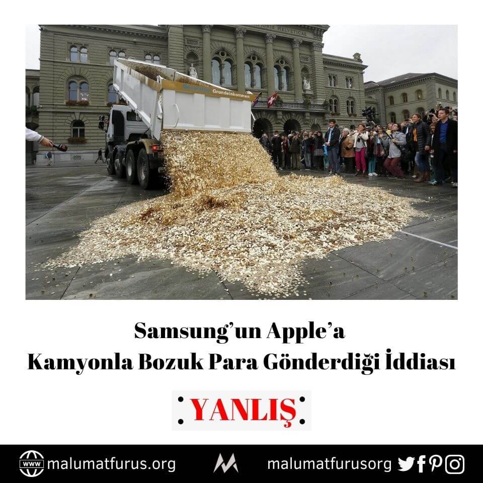 Samsung firmasının Apple’a tazminat ödemesini 30 kamyon dolusu bozuk para ile yaptığı yönündeki iddianın gerçekle ilgisi bulunmamaktadır.