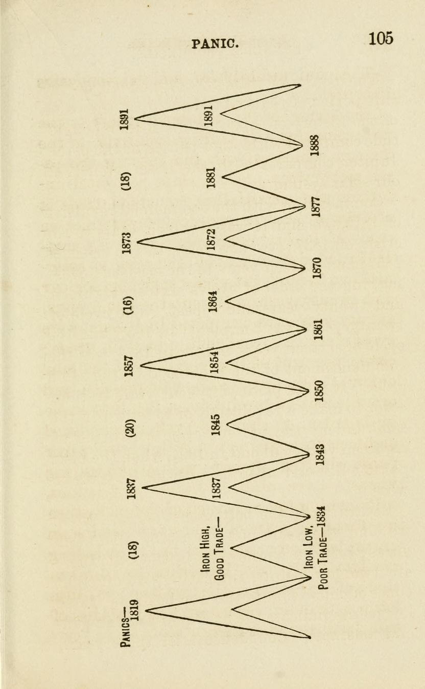 “Bu tablo 1875 yılında Samuel Benner’ın ‘Benner’s Prophecies’ kitabından bir alıntı Fiyatların gelecekte iniş ve çıkışlarını tahmin ediyor Tablodaki döngülere bakılınca kehanet gibi ne dersiniz?”