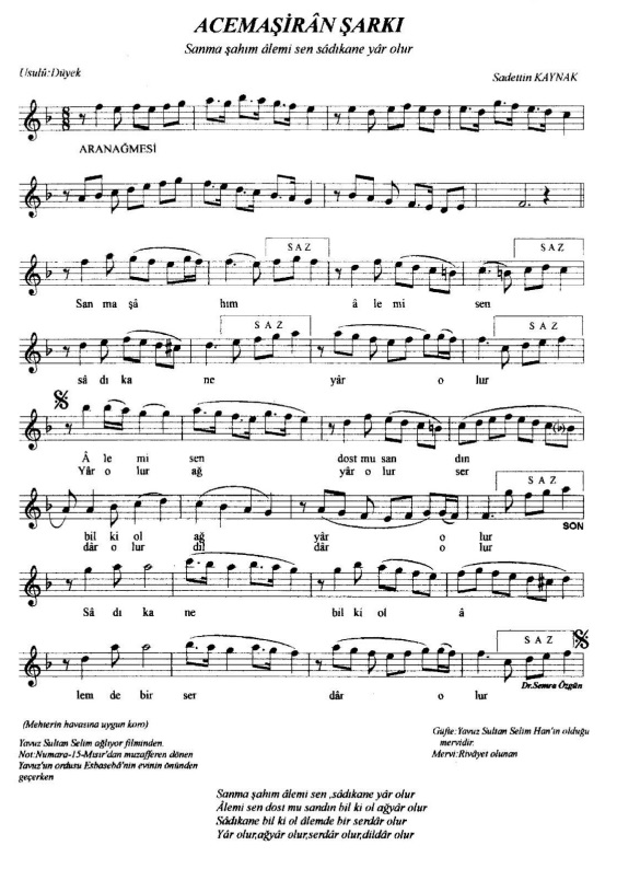 Acemaşiran şarkısı nota dökümünde güftenin Yavuz Sultan Selim’e aitliği “rivayet” vurgusuyla aktarılmış.