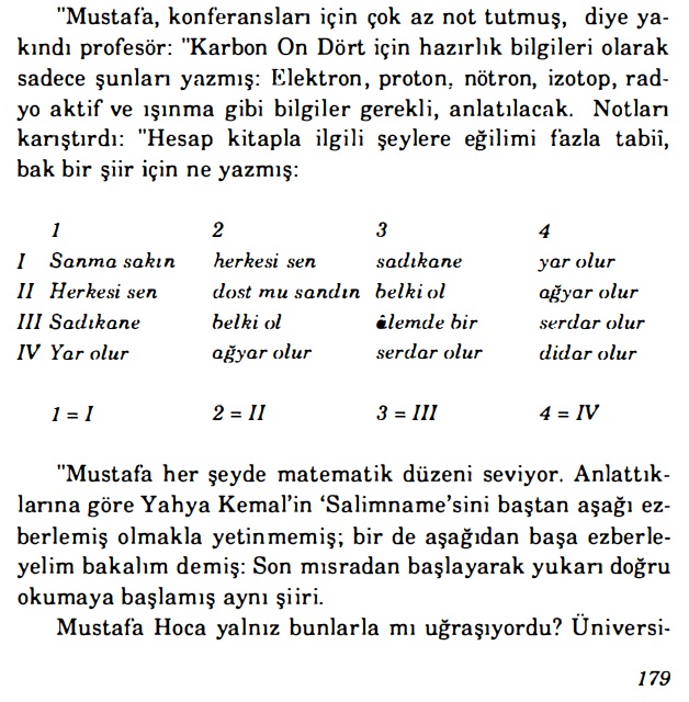 Mevzu bahis şiir ve düzeni, Oğuz Atay’ın “Bir Bilim Adamının Romanı” adlı biyografik eserinde matematiksel şiir düzeni olarak şöyle aktarılmıştı (Oğuz Atay (1975). Bir Bilim Adamının Romanı. Bilgi Yayınları. 1. Baskı):