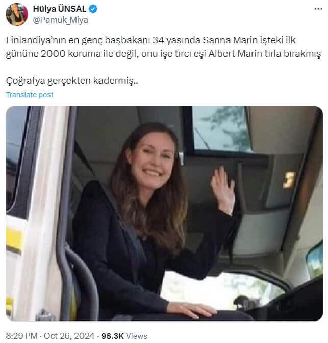 Hülya Ünsal (@Pamuk_Miya): “Finlandiya’nın en genç başbakanı 34 yaşında Sanna Marin işteki ilk gününe 2000 koruma ile değil, onu işe tırcı eşi Albert Marin tırla bırakmış Çoğrafya gerçekten kadermiş..”