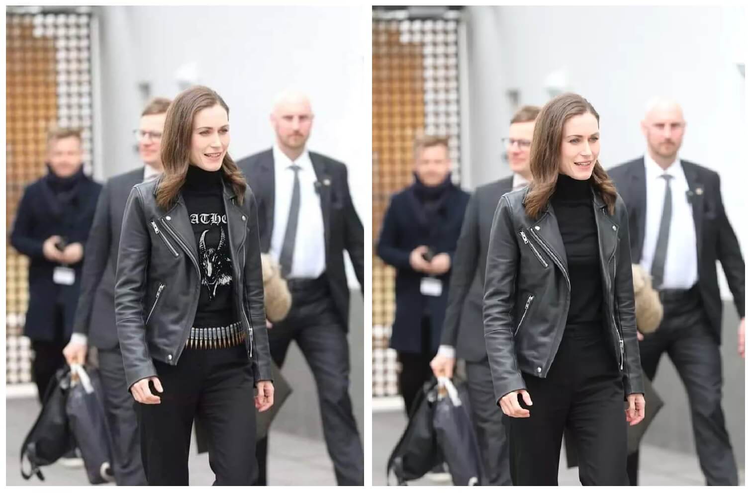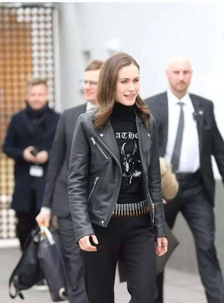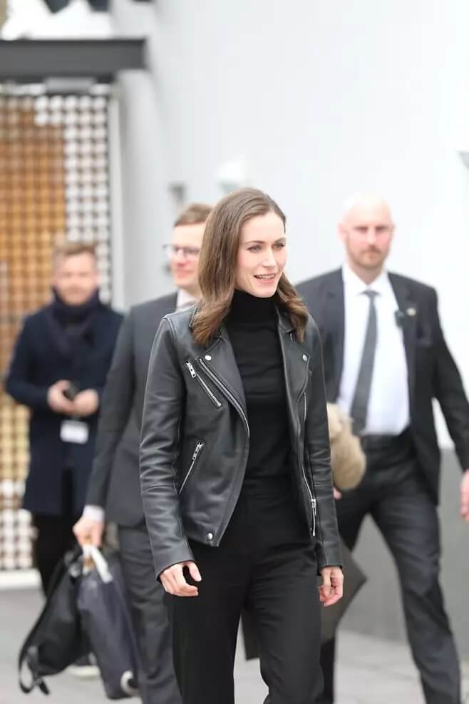 Başbakan Marin aslında siyah pantolon üzerine deri ceket altına düz siyah renkte bir tshirt giymişti.