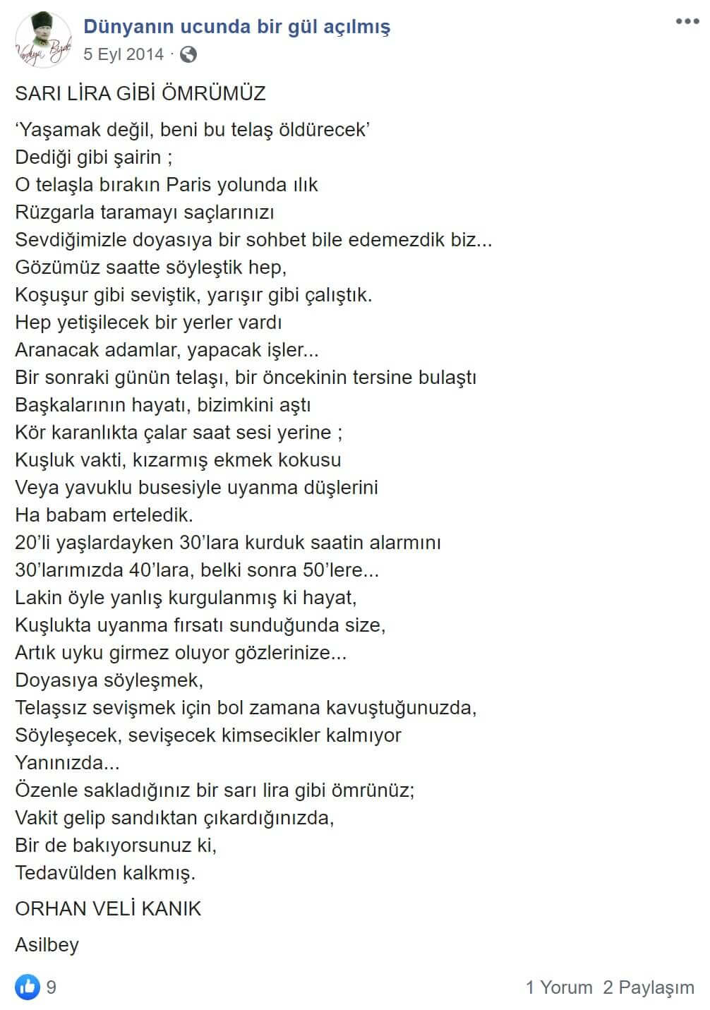 “Sarı Lira Gibi Ömrümüz” başlıklı şiirin Orhan Veli Kanık’a ait olduğunu öne süren paylaşım