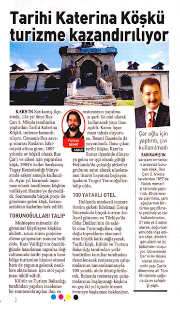 “KARS’IN Sarıkamış ilçesinde, 124 yıl önce Rus Çarı 2. Nikola tarafından yaptırılan Tarihi Katerina Köşkü, turizme kazandırılıyor. Osmanlı-Rus savaşı sonrası Rusların hâkimiyeti altına giren, 1897 yılında av köşkü olarak Rus Çar’ı ve ailesi için yaptırılan köşk, 1994’e kadar Sarıkamış Tugay Komutanlığı bünyesinde askeri amaçla kullanıldı. Aynı yıl korumalı taşınmaz olarak tescillenen köşkün mülkiyeti Hazine’ye devredildi. Sonrasında birçok proje ile gündeme gelen köşk, bakımsızlıktan kaderine terk edildi.”