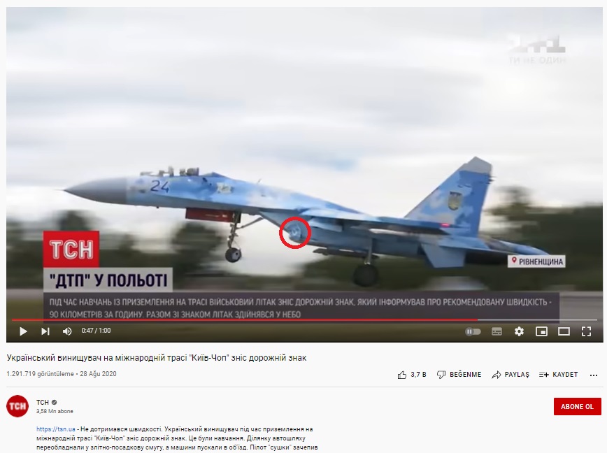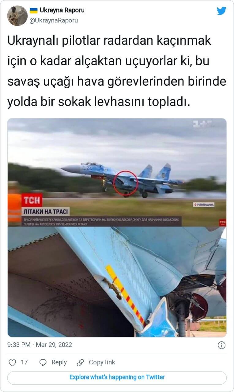 Rusya’nın Ukrayna’yı işgal harekâtı sürecinde Ukraynalı pilotların radara yakalanmamak adına alçak uçuş yaptığı esnada yol üzerindeki trafik levhasına çarptığı sanılarak paylaşılan görsel şu şekilde: