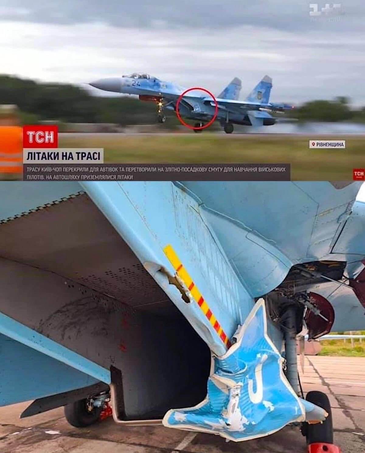 Görseldeki ilk kare, Ukrayna Hava Kuvvetleri’ne ait Sukhoi Su-27 savaş uçağının 27 Ağustos 2020 tarihinde Ukrayna’da gerçekleştirdiği ani taktik iniş tatbikatı esnasında bir trafik işaretine çarptığı anı yansıtıyor.