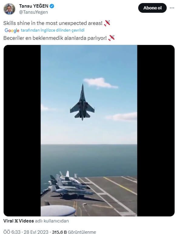 Bunlardan biri Tansu Yeğen‘in Twitter / X profilinde “Beceriler en beklenmedik alanlarda parlıyor! ️” (“Skills shine in the most unexpected areas! ️“) notuyla paylaştığı bir savaş uçağının uçak gemisine alışılagelmişin dışında bir manevra ile iniş yaptığı görülen videoydu (Bahsi geçen video geçmişte Hakikat Gazetesi adlı basın girişiminin sosyal medya hesaplarında “Yetenekli pilot, üssüne yaptığı bu akrobatik iniş ile akıllara durgunluk verdi” ifadeleriyle paylaşılmıştı).