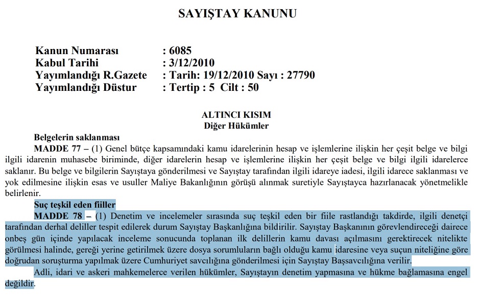 “Denetim ve incelemeler sırasında suç teşkil eden bir fiile rastlandığı takdirde, ilgili denetçi tarafından derhal deliller tespit edilerek durum Sayıştay Başkanlığına bildirilir. Sayıştay Başkanının görevlendireceği dairece onbeş gün içinde yapılacak inceleme sonucunda toplanan ilk delillerin kamu davası açılmasını gerektirecek nitelikte görülmesi halinde, gereği yerine getirilmek üzere dosya sorumluların bağlı olduğu kamu idaresine veya suçun niteliğine göre doğrudan soruşturma yapılmak üzere Cumhuriyet savcılığına gönderilmesi için Sayıştay Başsavcılığına verilir. Adli, idari ve askeri mahkemelerce verilen hükümler, Sayıştayın denetim yapmasına ve hükme bağlamasına engel değildir.”