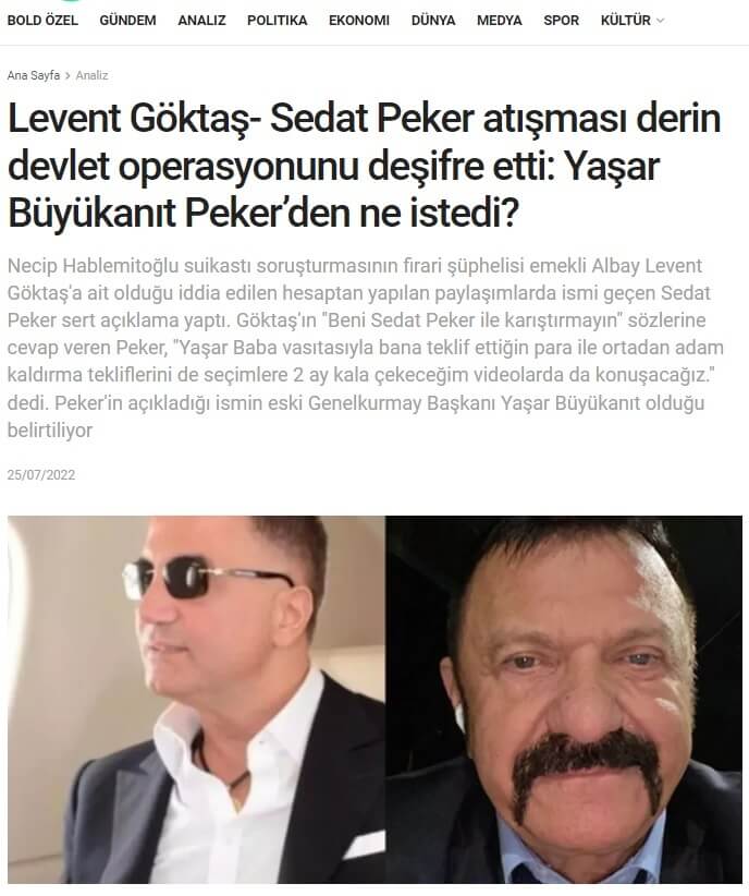 Necip Hablemitoğlu soruşturmasının firari şüphelisi emekli Albay Mustafa Levent Göktaş’a ait sanılan Twitter hesabının yaptığı paylaşımlara Sedat Peker’in verdiği yanıtlarda bahsi geçen “Yaşar Baba” adlı şahsın Türk Silahlı Kuvvetlerinin 25. Genelkurmay Başkanı Mehmet Yaşar Büyükanıt (1 Eylül 1940 – 21 Kasım 2019) olduğu Bold Medya tarafından ileri sürülmüştü.