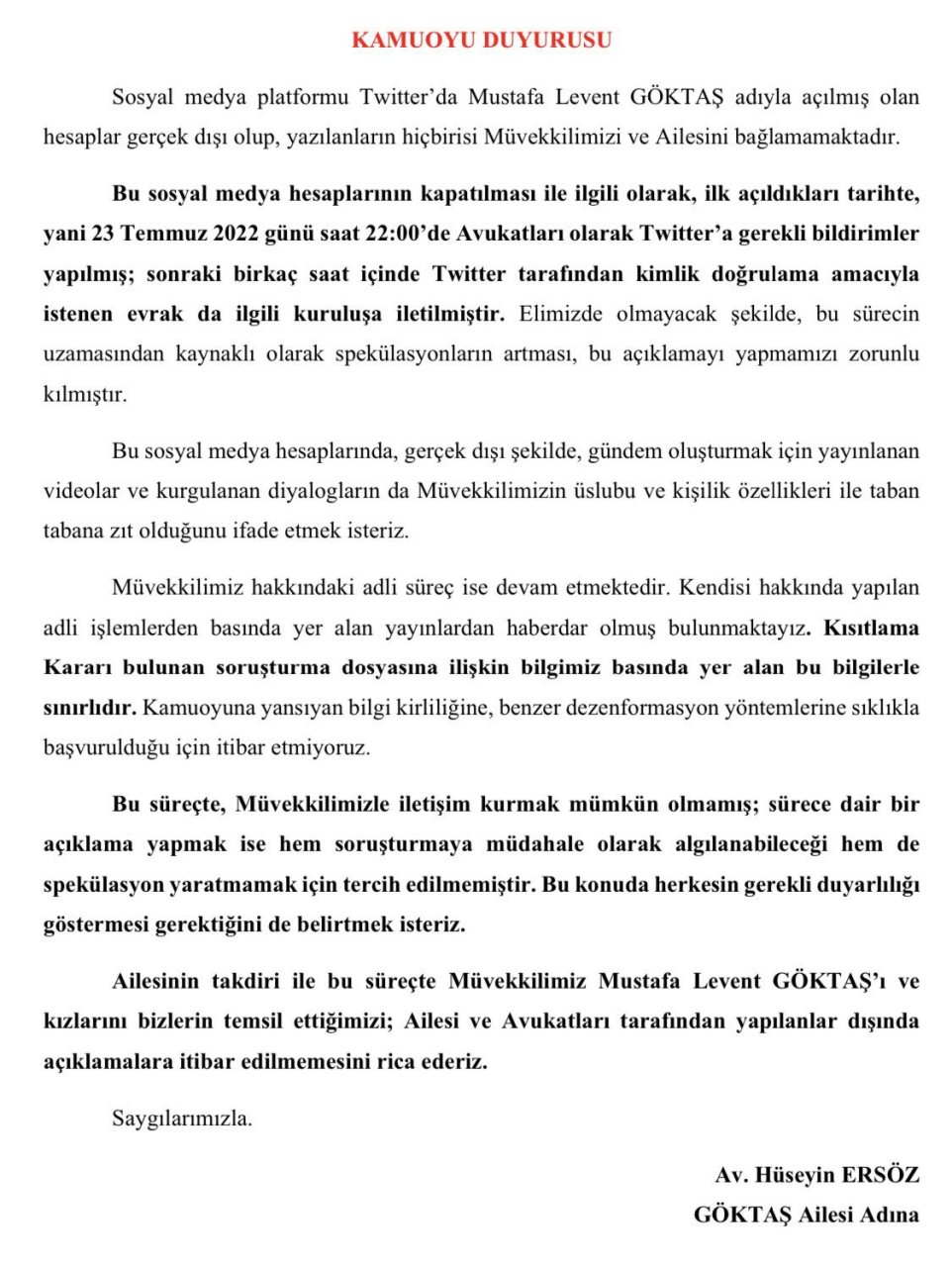 Levent Göktaş adına açılan @levent__goktas uzantılı Twitter hesabının sahte olduğu ailesi tarafından avukatları Hüseyin Ersöz aracılığıyla yapılan açıklamada duyurulmuştu.