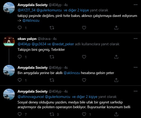 Ortaya attığı iddia gerçek sanılan Amygdala Society adlı hesap, trollemesinin bir sosyal deney olduğunu belirterek, paylaşımını alıntılayan habercileri ve (OdaTV gibi) basın organlarını eleştirdi.
