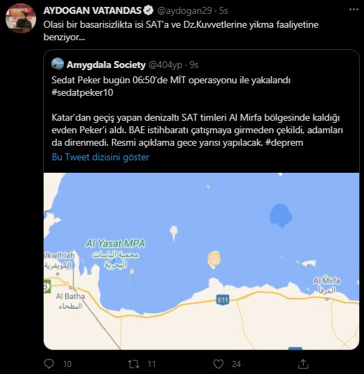 Youtube yayınlarında ve sosyal medya hesapları üzerinden dile getirdiği iddialarla ülke gündemini abluka altına alan Sedat Peker’in Birleşik Arap Emirlikleri’nde kaldığı evde MİT destekli SAT askerî operasyonu ile yakalandığı, operasyonun da Katar üzerinden İHA desteğiyle gerçekleştirildiği iddiası 13 Haziran 2021 Pazar günü sosyal medyanın ana odak noktasını oluşturmuştu.