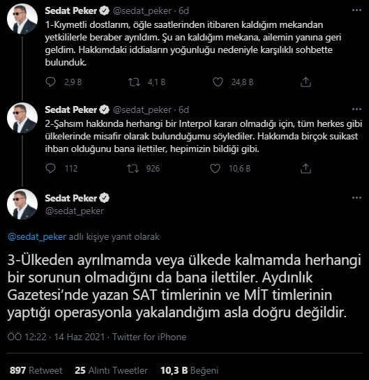 Sedat Peker ise uzun beklemenin ardından sosyal medyada ileri sürülen 13 Haziran sabahı BAE’de düzenlenen MİT operasyonuyla yakalandığı iddiasının gerçeği yansıtmadığını paylaştı.