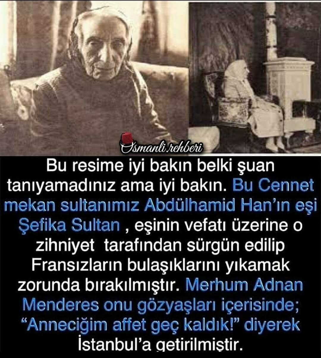 “Bu resime iyi bakın belki şu an tanıyamadınız ama iyi bakın. Bu cennet mekan sultanımız Abdülhamid Han’ın eşi Şefika Sultan, eşinin vefatı üzerine o zihniyet tarafından sürgün edilip Fransızların bulaşıklarını yıkamak zorunda bırakılmıştır. Merhum Adnan Menderes onu gözyaşları içerisinde; ‘Anneciğim affet geç kaldık!’ diyerek İstanbul’a getirilmiştir.”