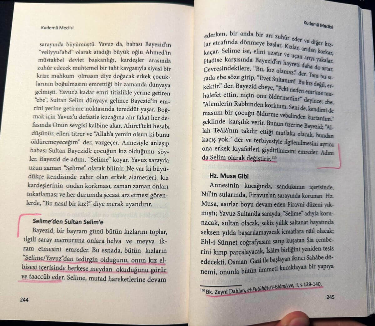 “Yavuz Sultan Selim doğduğunda ebesi ve annesi erkek olduğunu saklıyor. Çünkü fitneciler erkek çocukları öldürüyor. Selim’e, Selime diyorlar. Kız kıyafetleri giydirip, kız gibi büyütüyorlar.