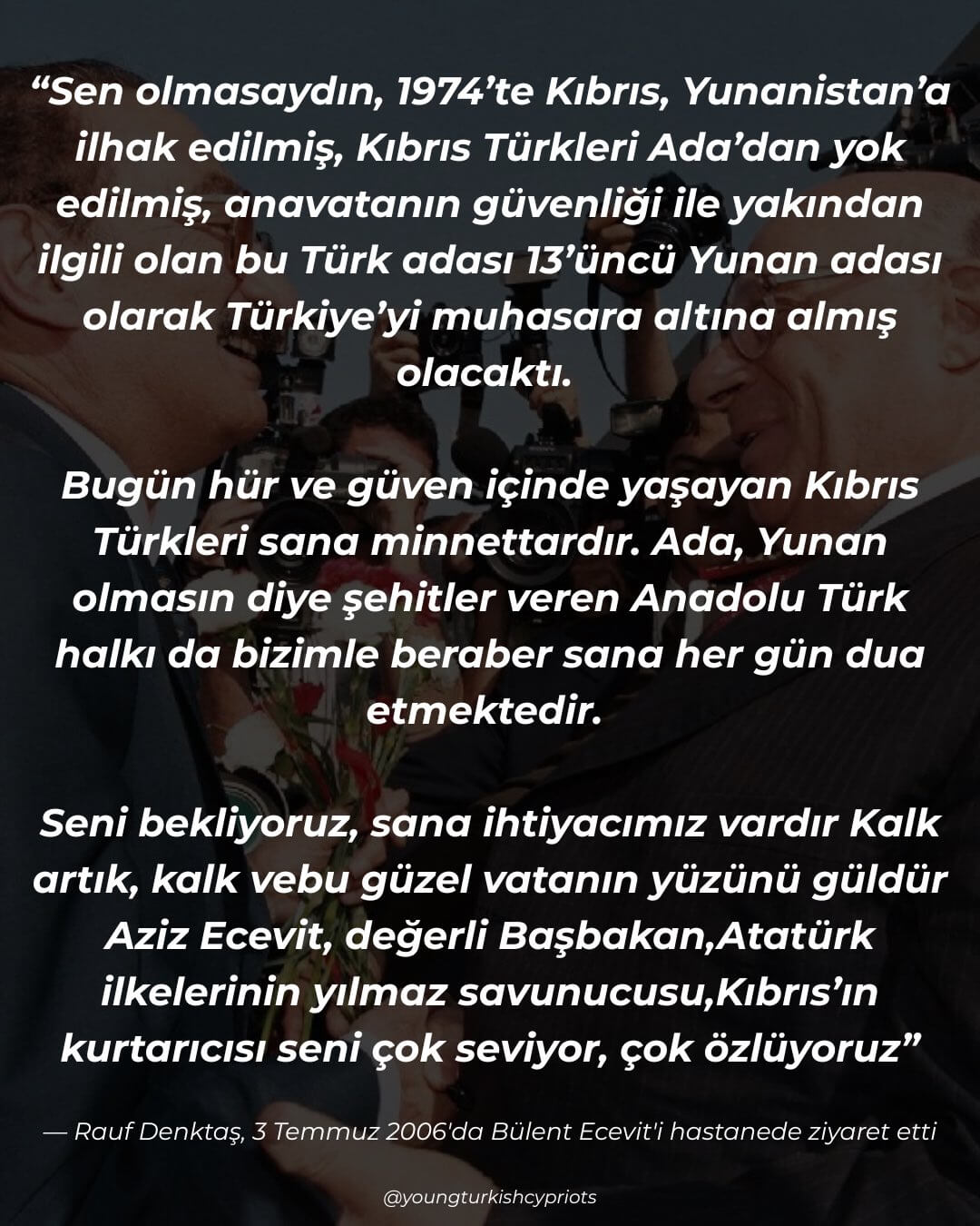 Bugün hür ve güven içinde yaşayan Kıbrıs Türkleri sana minnettardır. Ada, Yunan olmasın diye şehitler veren Anadolu halkı da bizimle beraber sana her gün dua etmektedir. Seni bekliyoruz, sana ihtiyacımız vardır. Kalk artık, kalk ve bu güzel vatanın yüzünü güldür. Aziz Ecevit, değerli Başbakan, Atatürk ilkelerinin yılmaz savunucusu, Kıbrıs’ın kurtarıcısı seni çok seviyor, çok özlüyoruz.”