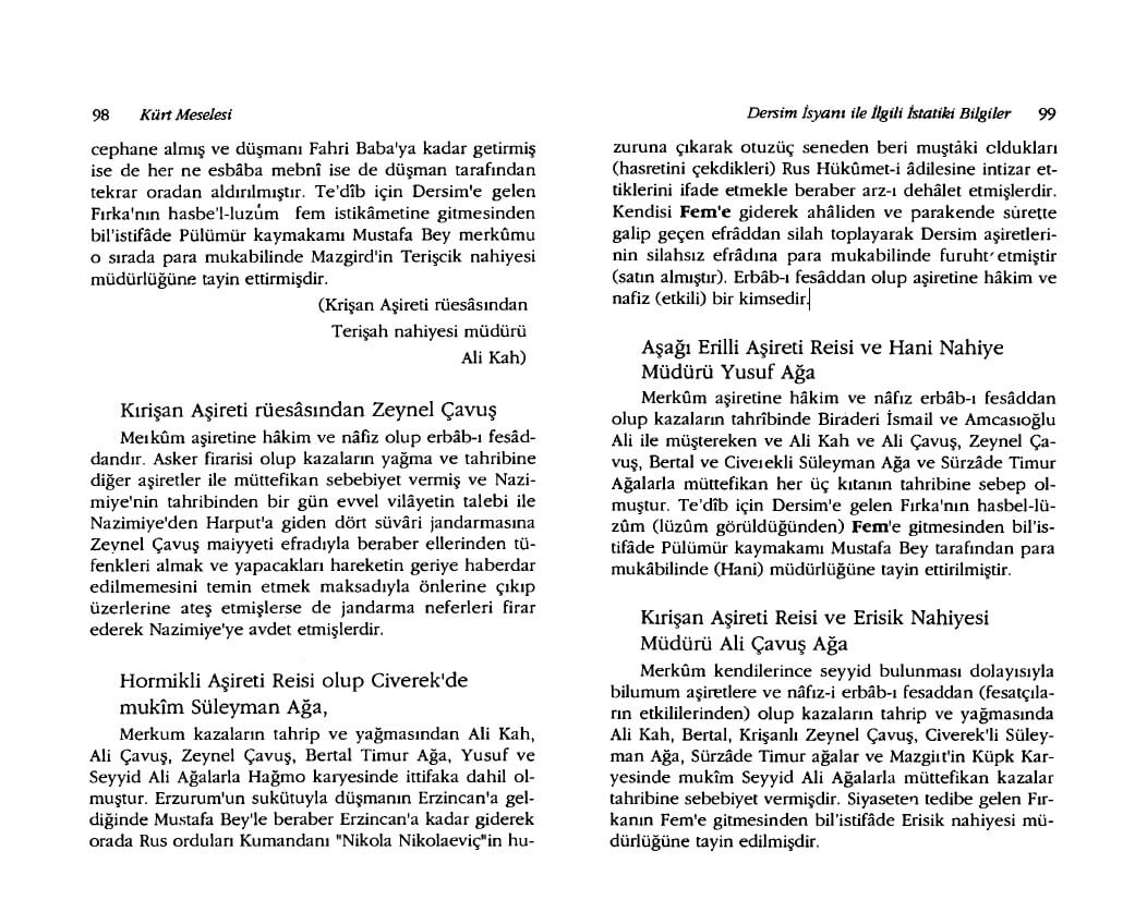 Merkum kazaların tahrip ve yağmasından Ali Kah, Ali Çavuş, Zeynel Çavuş, Bertal Timur Ağa, Yusuf ve Seyyid Ali Ağalarla Hağmo karyesinde ittifaka dahil olmuştur. Erzurum’un sükûtuyla düşmanın Erzincan’a geldiğinde Mustafa Bey’le beraber Erzincan’a kadar giderek orada Rus orduları Kumandanı “Nikola Nikolaeviç”in huzuruna çıkarak otuzüç seneden beri muştâki oldukları (hasretini çekdikleri) Rus Hükûmet-i âdilesine intizar ettiklerini ifade etmekle beraber arz-ı dehalet etmişlerdir. Kendisi Fem’e giderek ahâliden ve parakende surette galip geçen efrâddan silah toplayarak Dersim aşiretlerinin silahsız efradına para mukabilinde furuht’ etmiştir (satın almıştır). Erbâb-ı fesâddan olup aşiretine hâkim ve nafiz (etkili) bir kimsedir.