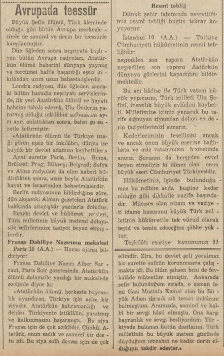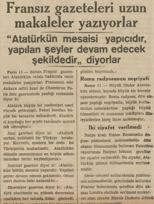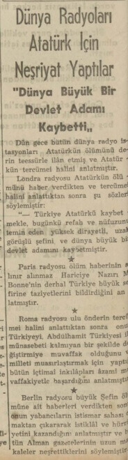 “Ayni surette Paris, Berlin, Roma, Brüksel, Prag, Bükreş, Belgrad, Sofya ve Atina radyoları da elim haberi bildirdikten sonra, uzun boylu Atatürk’ün hayat ve icraatından bahsetmişlerdir.”