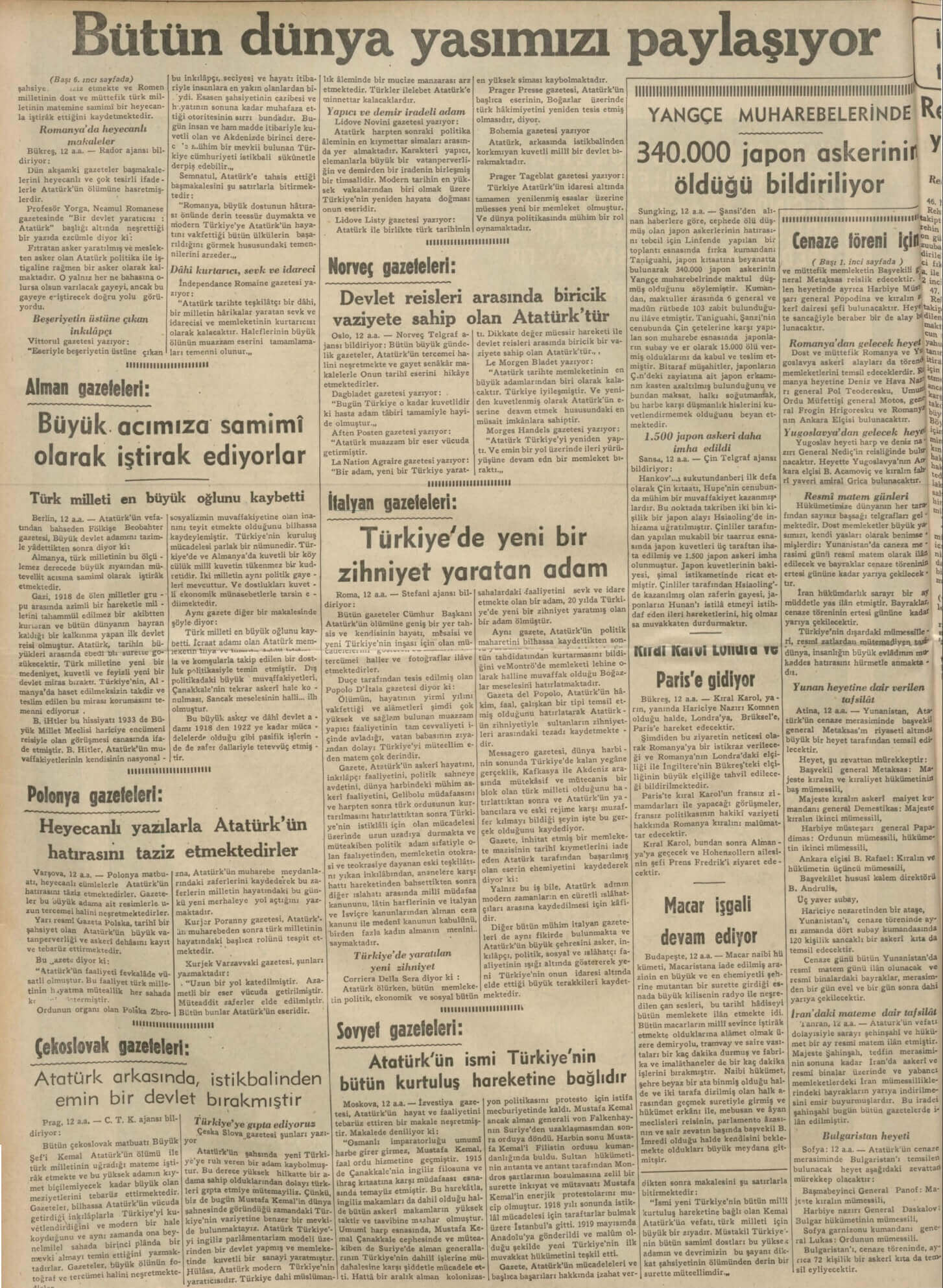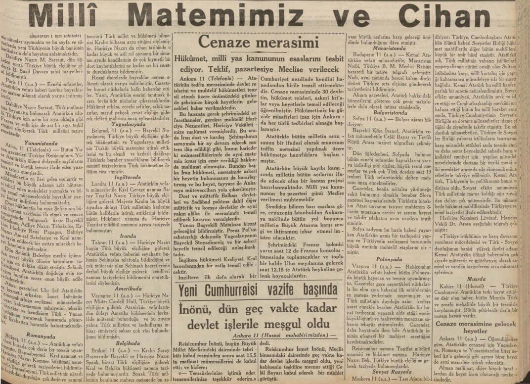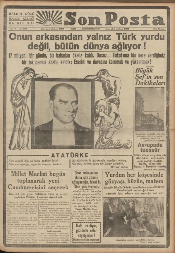 Bütün gazeteler Cümhur Başkanı Atatürk’ün ölümüne geniş bir yer tahsis ve kendisinin hayatı, mesaisi ve yeni Türkiye’nin inşası için mücadelesini … tercümei haller ve fotoğraflar ilave etmektedirler.