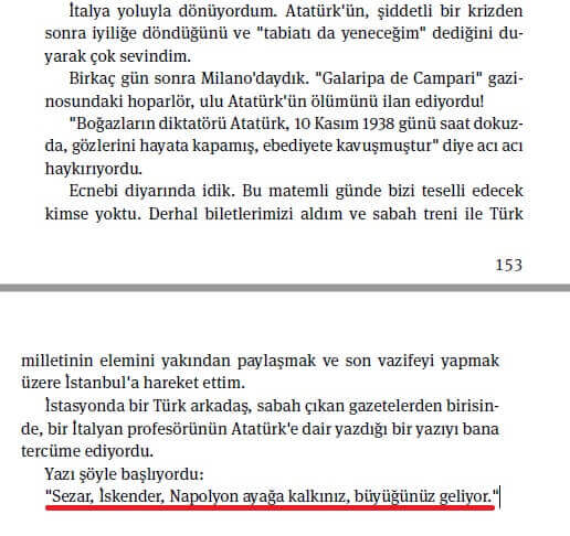 “En son instagram’da şöyle bir şeyle karşılaştım: “Atatürk’ün hayatını kaybettiği gün bir İtalyan radyosunun anonsu: Sezar, İskender, Napolyon ayağa kalkın, büyüğünüz geliyor.”