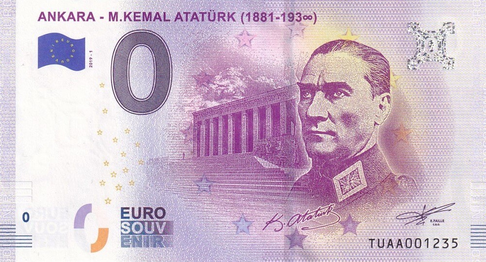 2019 yılında basımı gerçekleştirilen 0 Avro yazılı ve Atatürk resimli banknotlar incelendiğinde, üzerlerinde Avrupa Merkez Bankası ile ilgili bir ibarenin yer almadığı, (Avro Hatıra anlamına gelen) “Euro Souvenir” yazısının bulunduğu, banknot üzerindeki imzanın şirketin genel müdürü Richard Faille’ye ait olduğu görülebiliyor.