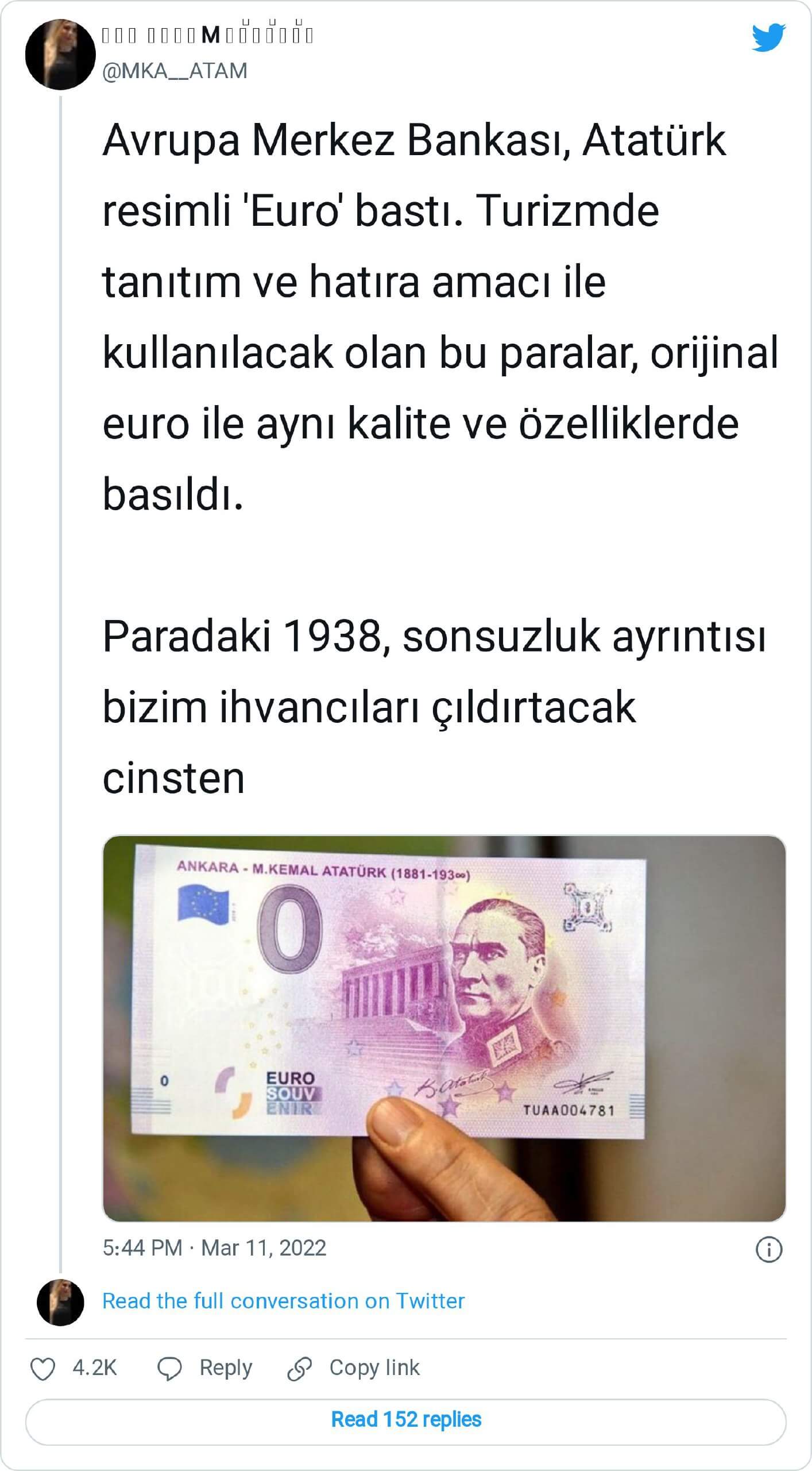 Dursun Çiçek (@drdursuncicek): “Avrupa Merkez Bankası, Atatürk resimli “Euro” bastı. Paradaki Atatürk imzası, 1938, “Sonsuzluk” ayrıntısı, üstelik atalarını her girdiği savaşta yenen bir komutana, bir devlet adamına verdikleri saygıya bakın… Türkiye’deki Atatürk düşmanlarına ibret olsun.”