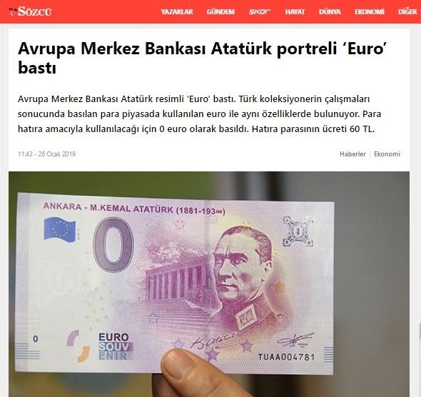 “Avrupa Merkez Bankası, Atatürk resimli ‘Euro’ bastı. Turizmde tanıtım ve hatıra amacı ile kullanılacak olan bu paralar, orijinal euro ile aynı kalite ve özelliklerde basıldı. Paradaki 1938, sonsuzluk ayrıntısı bizim ihvancıları çıldırtacak cinsten”
