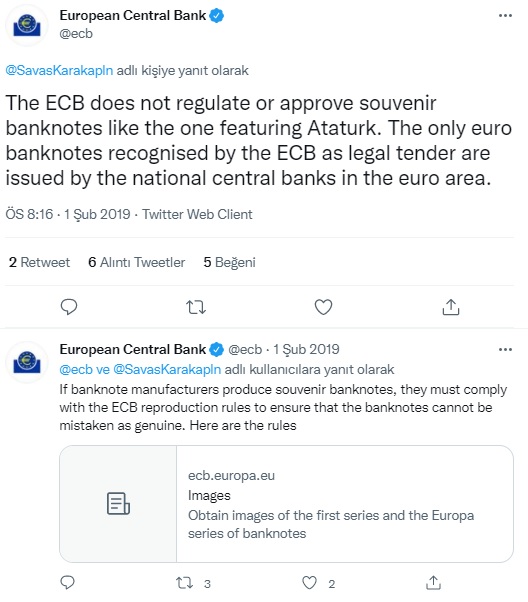 “AMB, Atatürk’ün görüldüğü hatıra banknotlarını düzenlememekte ya da onaylamamaktadır. AMB tarafından yasal ödeme aracı olarak tanınan tek euro banknotları, euro bölgesindeki ulusal merkez bankaları tarafından basılmaktadır.”