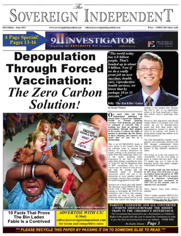 İddia edilenin aksine The Sovereign Independent adlı İrlanda gazetesinin Haziran 2011 tarihli “Depopulation Through Forced Vaccination: The Zero Carbon Solution!” manşetli sayısının elektronik kopyasına erişmek mümkün.