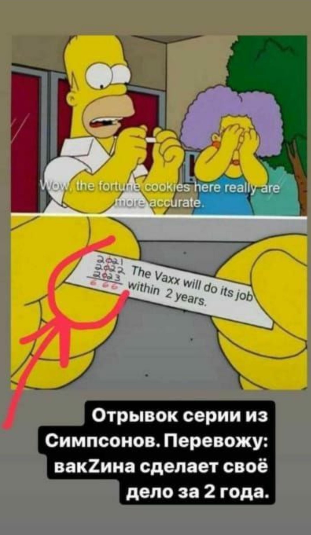 Simpsonların geleceğe yönelik başarılı tahminlerinden hareketle bir bölümde Homer Simpsons’ın açtığı şans / fal kurabiyesinden (fortune cookie) “Aşı, etkisini 2 yıl içinde gösterecek” notunun ve “2021 2022 2023 ———– 666” sayılarının çıktığı yönündeki montaj görsel paylaşılmaya başlamış.
