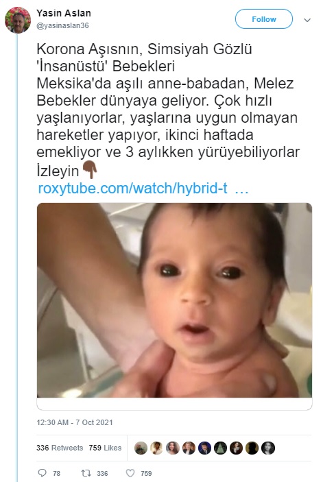 “Korona Aşısnın, Simsiyah Gözlü ‘İnsanüstü’ Bebekleri Meksika’da aşılı anne-babadan, Melez Bebekler dünyaya geliyor. Çok hızlı yaşlanıyorlar, yaşlarına uygun olmayan hareketler yapıyor, ikinci haftada emekliyor ve 3 aylıkken yürüyebiliyorlar”