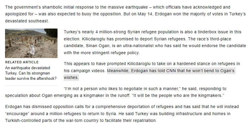 “Bu, Kılıçdaroğlu’nu kampanya videolarında mülteciler konusunda sert bir tavır almaya sevk etmiş gibi görünüyor. Bu arada Erdoğan, CNN’e Oğan’ın isteklerine boyun eğmeyeceğini söyledi.