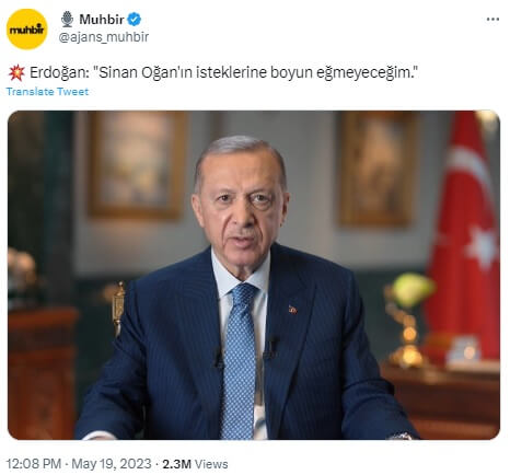 Cumhurbaşkanı Erdoğan CNN International’a verdiği mülakatta Sinan Oğan’la desteği karşılığında beklenen tarzda bir müzakere yapmayacağını söylese de “Sinan Oğan’a boyun eğmeyeceğim” şeklinde bir ifade kullanmamış.