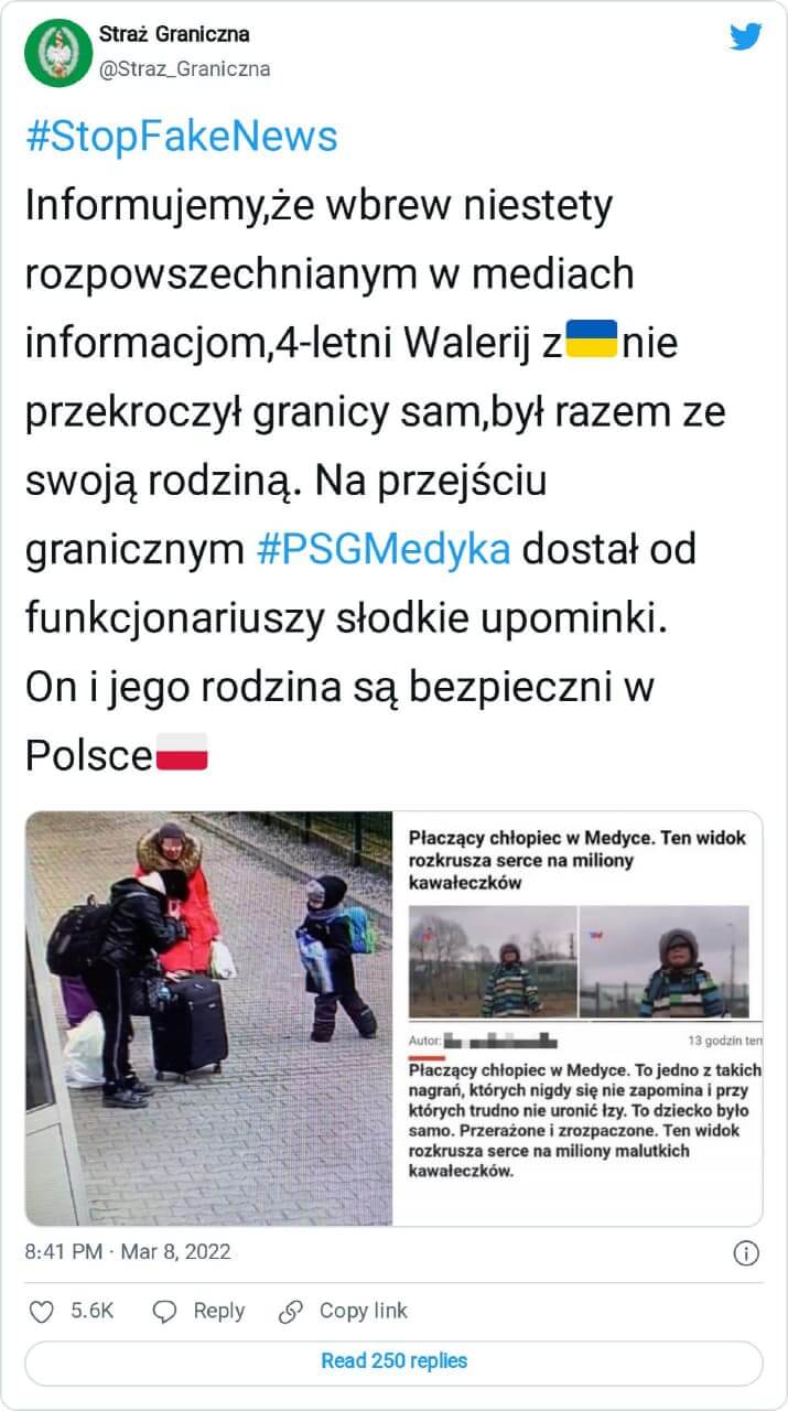 “4 yaşındaki Valerij , medyada maalesef yayılan haberin aksine sınırı tek başına geçmediğini, ailesiyle birlikte olduğunu bildirmek isteriz. Sınır kapısında #PSGMedyka görevlilerden tatlı hediyeler aldı. O ve ailesi Polonya’da güvende”