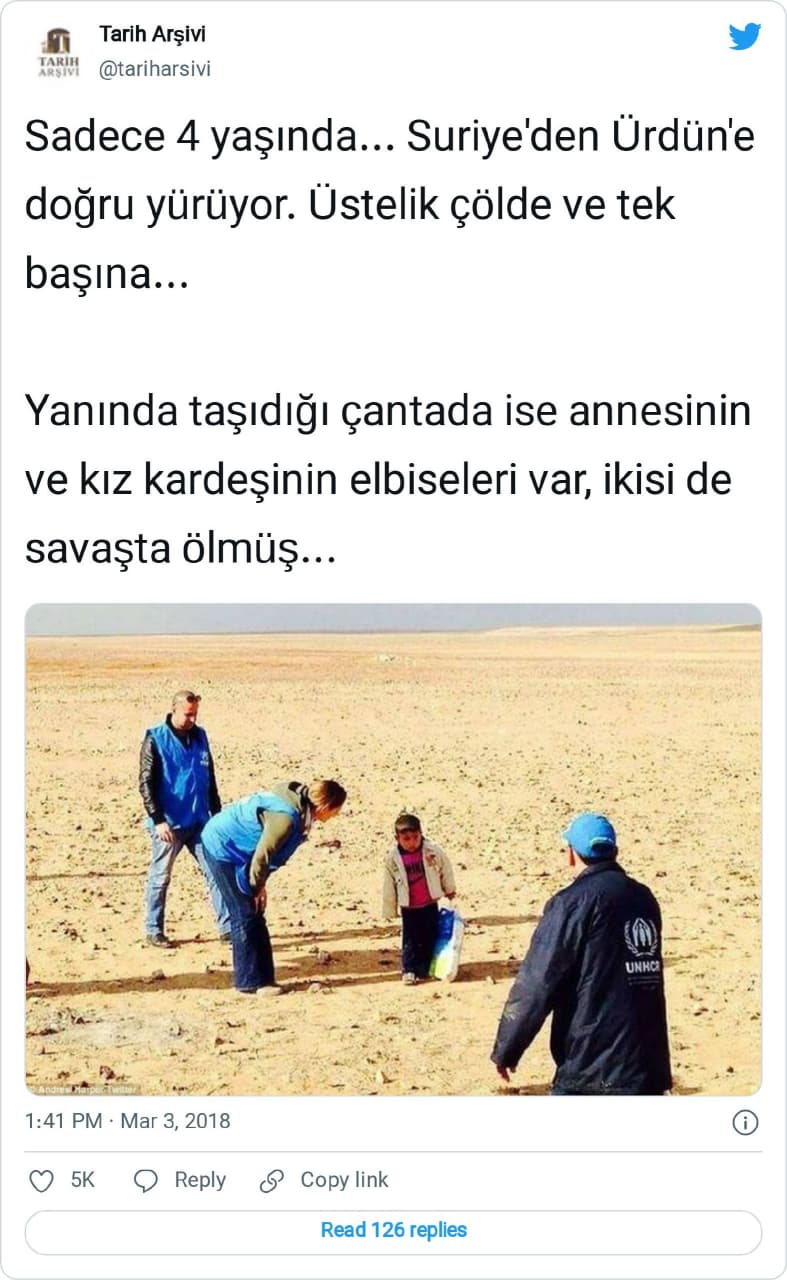 Daha önce, “Sadece 4 yaşında… Suriye’den Ürdün’e doğru yürüyor. Üstelik çölde ve tek başına… Yanında taşıdığı çantada ise annesinin ve kız kardeşinin elbiseleri var, ikisi de savaşta ölmüş…” notuyla sosyal medyada paylaşılan fotoğraftaki 4 yaşındaki Mervan adlı Suriyeli çocuğun çölü tek başında geçmediği, sadece ailesinden 20 adım geride kaldığı anlaşılmıştı. BM Mülteciler Yüksek Komisyonu’nda (UNCHR) çalışan Andrew Harper, Twitter hesabından, Suriye- Ürdün sınırında çölü tek başına yürüyerek geçtiği düşünülen Suriyeli mülteci çocuğun fotoğrafını paylaşmıştı.
