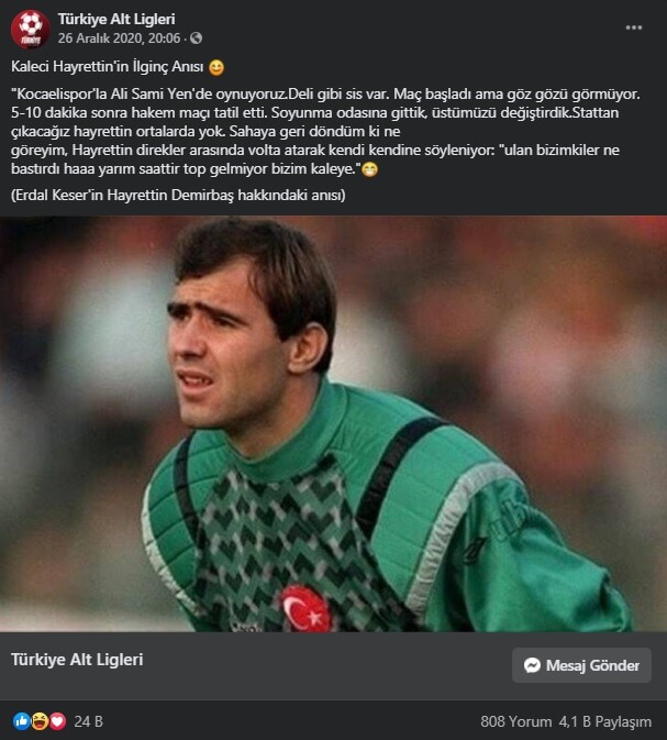 “Kocaelispor’la Ali Sami Yen’de oynuyoruz. Deli gibi sis var. Maç başladı ama göz gözü görmüyor. 5-10 dakika sonra hakem maçı tatil etti. Soyunma odasına gittik, üstümüzü değiştirdik. Stattan çıkacağız hayrettin ortalarda yok. Sahaya geri döndüm ki ne göreyim, Hayrettin direkler arasında volta atarak kendi kendine söyleniyor: “ulan bizimkiler ne bastırdı haaa yarım saattir top gelmiyor bizim kaleye.”