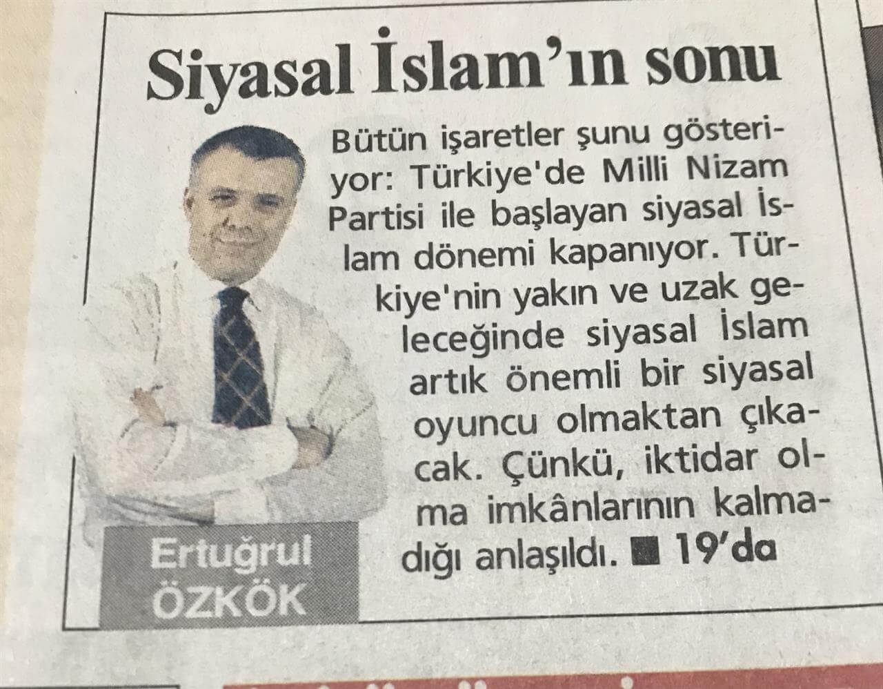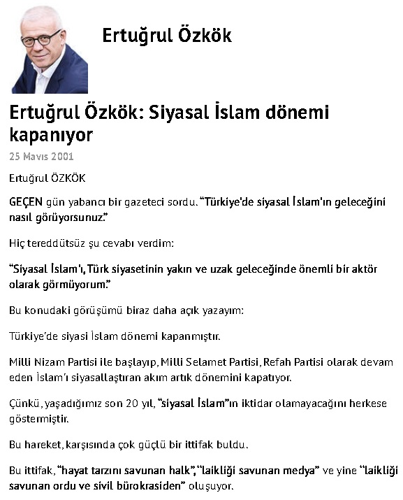 Ertuğrul Özkök, Hürriyet Gazetesinde 25 Mayıs 2001 tarihinde yayınlanan “Siyasal İslam dönemi kapanıyor” başlıklı köşe yazısında siyasal İslam’ın Türkiye siyasetinde önemli rol oynayamayacağı ve iktidar olamayacağını iddia ederek ters köşe olmuş: