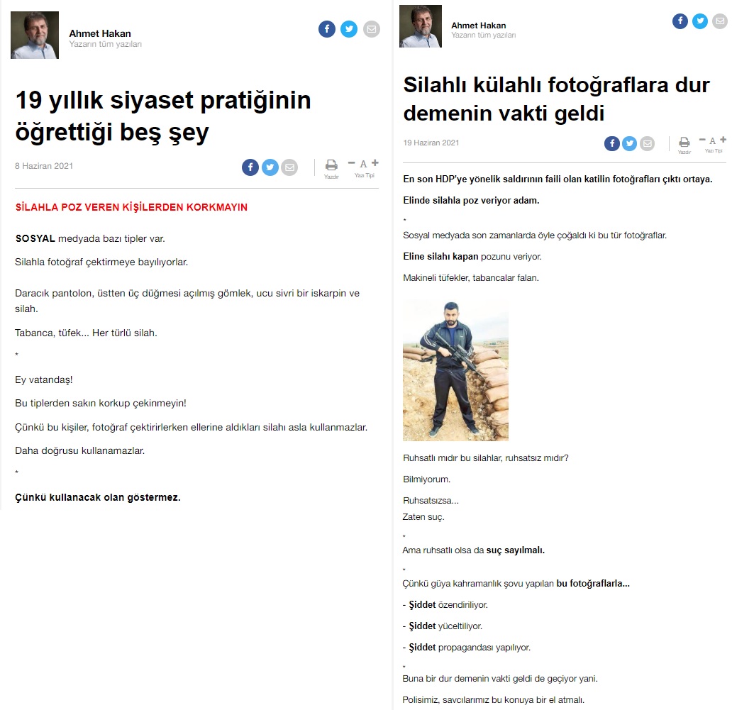 Hürriyet gazetesi Genel Yayın Yönetmeni Ahmet Hakan, “silahla poz verenlerden korkmayın” (alt) başlıklı yazısının üzerinden sadece 11 gün geçtikten sonra (HDP İzmir il binasına yapılan saldırının ardından) “silahlı külahlı fotoğraflara dur demenin vakti geldi” başlıklı bir yazı yayımladı.