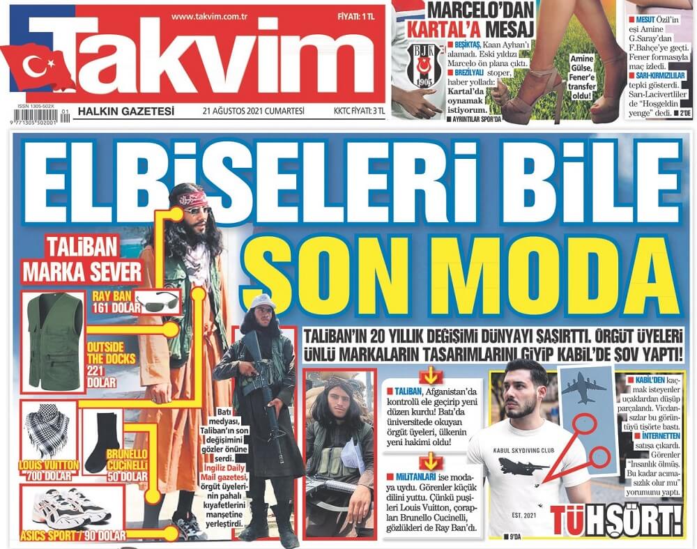 Takvim, Afgan Muhabir Sakina Amiri’nin sorularını yanıtlayan Taliban militanın kıyafetlerine yönelik sosyal medyada başlatılan “Steal His Look” başlıklı mizahî paylaşımı gerçek sanarak 21 Ağustos 2021 günkü sayısında “Elbiseleri Bile Son Moda” manşetiyle aktarmıştı.