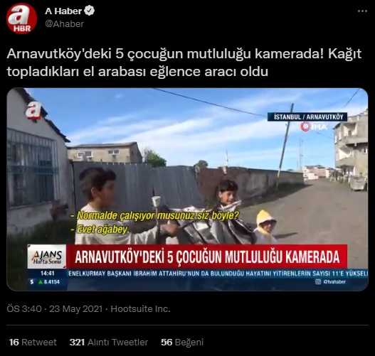 A Haber, okulda eğitim görmesi gerektiği hâlde sokakta her gün kağıt toplayan çocukların eğlendiği bir anı yakaladığı görüntüyü “iç ısıttığı” vurgusuyla “Arnavutköy’deki 5 çocuğun mutluluğu kamerada! Kağıt topladıkları el arabası eğlence aracı oldu” KJ’si ile birlikte servis etmişti.