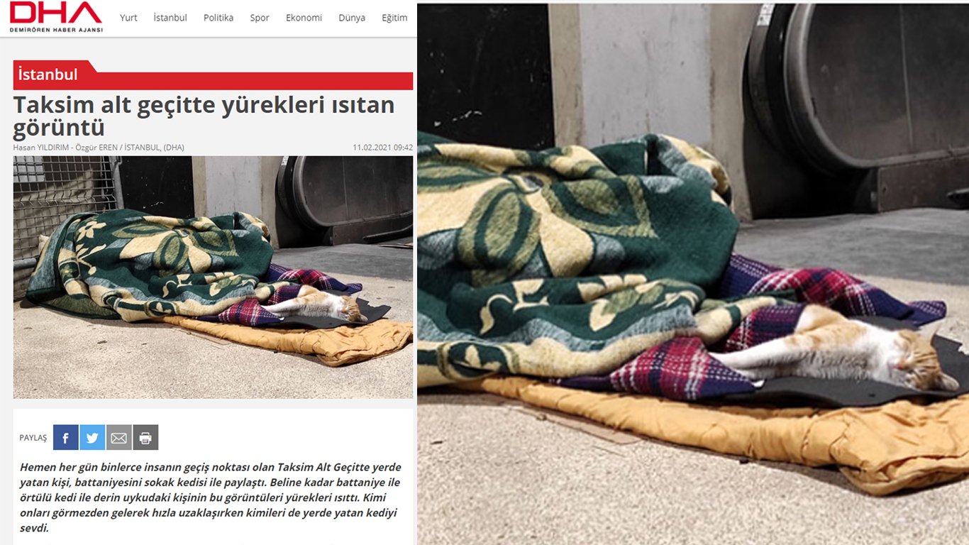 Yürekleri ısıtmak yerine dağlaması beklenen sokakta yatan vatandaşa eşlik eden kedi görüntüsünü DHA, “Taksim alt geçitte yürekler ısıtan görüntü” ifadesiyle sunmayı tercih etmişti.
