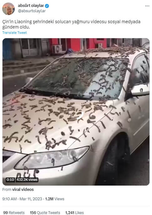 absürt olaylar: “Çin’in Liaoning şehrindeki solucan yağmuru videosu sosyal medyada gündem oldu.”