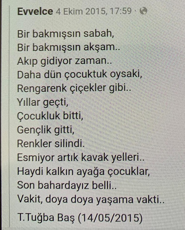 T. Tuğba Baş’ın 2015 yılında sosyal medya hesaplarında paylaşmasının ardından bu şiir farklı isimlere isnat edilerek dolaşıma sokulmuş.